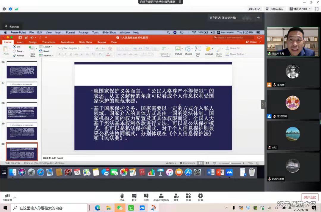 与谈环节中,韩秀义教授表示赞成汪教授的体系化思路,并进一步提出对个人信息权的体系化解释或可不仅仅局限于《个人信息保护法》,而是考虑以宪法为基础,以包括个人信息保护相关法律法规为框架,进行更为充分的体系化解释的思路。