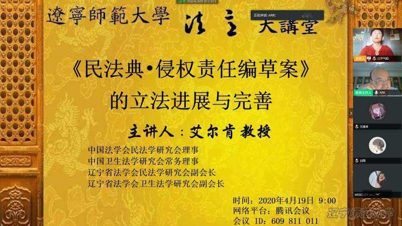 2020年4月19日上午9时,2020年度法意大讲堂依托腾讯会议平台开讲。法学院艾尔肯教授作了题为“《民法典•侵权责任编草案》的立法进展与完善”的讲座。