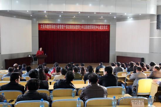 2013年11月15日,大连市青少年法制教育研究中心(以下简称“研究中心”)成立仪式暨教育行政管理干部法制培训在beat365vip官网登录入口学术报告厅隆重举行。大连市人民政府教育督导室主任督学、教育局副局长张鹏越,大连市教育局副巡视员吕伟明,beat365vip官网登录入口副校长、博士生导师李庆伟,beat365vip官网登录入口党委宣传统战部部长王建平,beat365vip官网登录入口科研处处长、博士生导师岳崇兴,beat365vip官网登录入口法学院院长丁慧,党总支书记任福田等应邀出席。大连市、县两级教育行政管理部门的领导干部出席了本次会议。仪式由大连市教育局计划与法规处副处长殷国安主持,本次会议分为两个阶段。